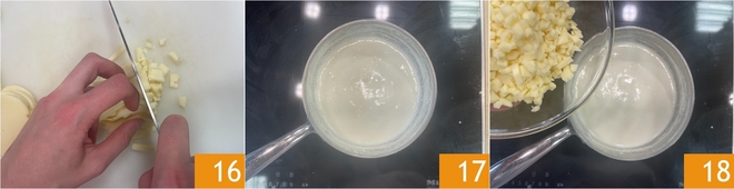 Focus on the provola sauce. Cut the provola into small cubes 17 and pour the cream into a saucepan, reducing it slightly over very low heat until it thickens by 60%, which will take about a quarter of an hour. Add the provola to the hot cream 18.