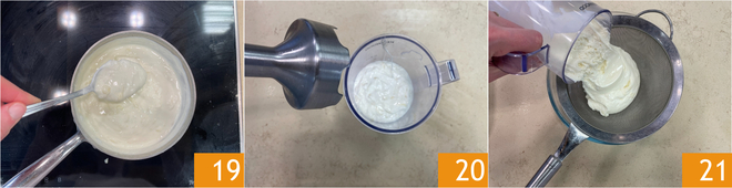 Stir until completely melted 19. Transfer the mixture to the blender jar 20, blend until smooth, and then pass it through a fine-mesh sieve (chinoise) 21 for a velvety consistency.