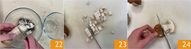 Now move on to the mushrooms. How to Clean Porcini Mushrooms with a damp cloth, remove the earthy part with a small knife 22, and cut 300 g into regular cubes 23. Thinly slice the remaining 50 g of porcini 34.
