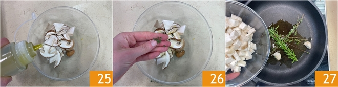 Transfer them to a bowl and season with a drizzle of extra virgin olive oil 25 and a pinch of salt, then add a few fresh thyme leaves 26, set them aside for garnishing the dish. Now, sauté the remaining cubed mushrooms in a pan: heat a drizzle of oil with garlic, rosemary, and thyme, then add the porcini cubes 27.