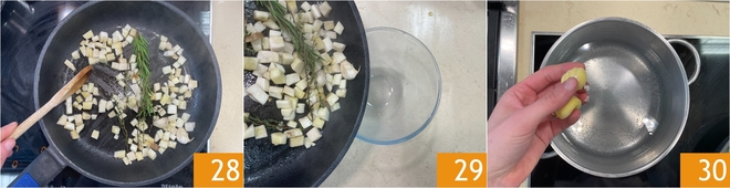 Brown them over high heat for a few minutes 28, they should not change color. Transfer them to a bowl 29 and set aside. Meanwhile, bring a pot of salted water to a boil and add the gnocchi 30. Cook until they float to the surface.