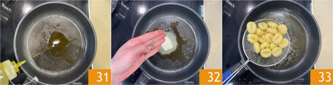 While the gnocchi cooks, prepare their seasoning: in the same pan where you cooked the mushrooms, pour a little olive oil 31, butter, stripped thyme, and a sprinkle of pepper 32. Drain the gnocchi directly into the pan 33.