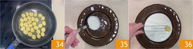 Let them season for a few moments 34. Now you're ready to plate: pour a ladle of provola sauce on the bottom 35 and place the gnocchi on top 36. If the sauce sets, heat it in the microwave for a few seconds.