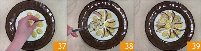 Decorate with the slices of raw porcini 37. Then add the sautéed mushrooms 38 and finish with a drizzle of raw extra virgin olive oil and a grind of black pepper. Serve your gnocchi with mushrooms and provola immediately 39.