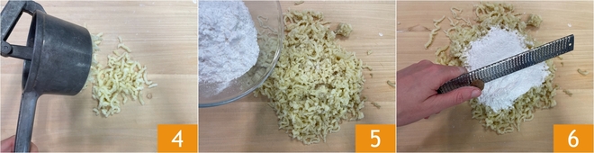 Press them with a potato masher 4, collecting the puree on a work surface. Add salt and rice starch 5, then season with a sprinkle of nutmeg 6.