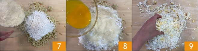 Add the grated Parmesan 7 and finally the pasteurized egg yolk 8. Knead with your hands 9 until you obtain a homogeneous mixture.