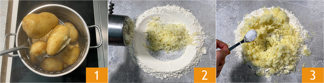 To prepare the gnocchi with shrimp and stracciatella, first boil the potatoes for about 35 minutes 1. Drain and let them cool slightly, then mash them on the work surface over the flour arranged in a fountain 2. Add the salt 3.