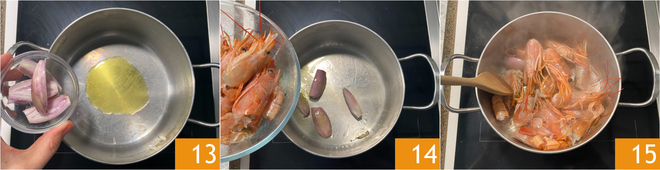In a pot, pour a drizzle of oil, add the shallot cut into 4 13, and sauté for a few minutes. At this point, add the shrimp heads and shells 14 and crush with a ladle 15.