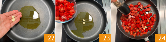 In a pan, heat a drizzle of oil with the garlic cloves 22, then add the cherry tomatoes 23, salt, and pepper 34.