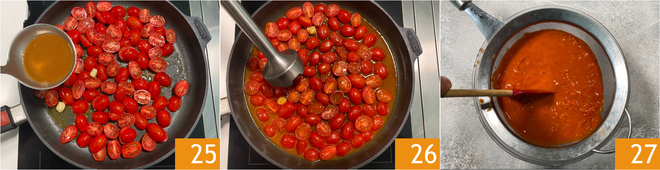 Pour 1-2 ladles of bisque into the pan 25 and cook for 15 minutes over medium heat. Once cooked, remove the garlic and blend the tomatoes with an immersion blender 26. Strain the mixture to make it even smoother and creamier 27, then transfer it back to the pan.