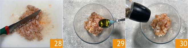 Finely chop the peeled shrimp with a knife 28 and transfer them to a small bowl. Season with oil 29, salt, and pepper 30.