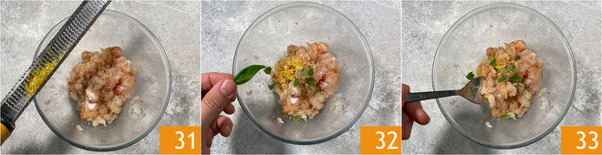 Flavor with lemon zest 31 and chopped basil 32, then mix gently 33.