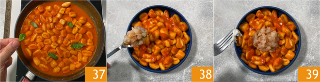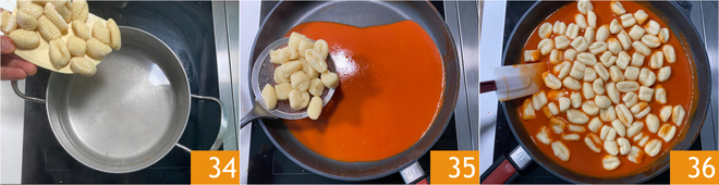At this point, cook the gnocchi in plenty of salted boiling water 34. As soon as they float to the surface, drain them into the pan 35. Stir and cook for about a minute 36.