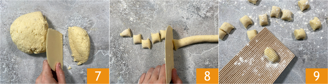 Work with one portion of dough at a time 7, taking care to cover the remaining dough with a cloth to prevent it from drying out. Dust the work surface with semolina and form rolls 3/4 inch thick, then cut them into pieces 8. Put some semolina on the gnocchi board and gently roll each piece over it 9. Place the gnocchi on a clean cloth dusted with semolina as you go.