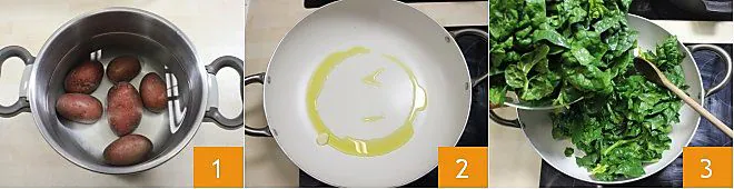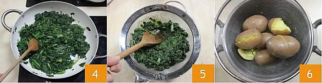 cover the pan with a lid and cook for a few minutes until the spinach is well-cooked 4. Drain the spinach with a sieve 5; they must be very dry to prevent them from releasing water. Salt them and let them cool. Now focus on the potatoes: once cooked 6,