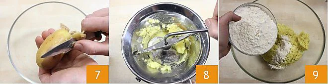 peel them while still hot 7 and mash them with a food mill 8 or a potato masher, collecting them in a bowl. Add the sifted flour 9, salt, and pepper and