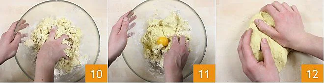 knead by hand 10, incorporate the whole egg 11, continue kneading until you get a workable dough 12. Knead quickly, always keeping the surface floured.