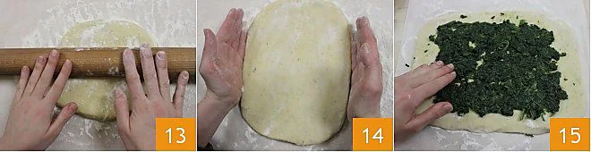 With a rolling pin, roll out the dough on a sheet of parchment paper 13 until it forms a rectangle measuring 8 inches x 11 inches 14. Place the spinach on top, leaving about 0.6 inches of space from the edge 15.