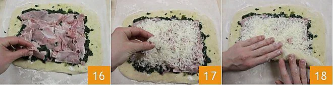 Then lay the slices of ham 16 and season with grated Grana Padano 17. Now fold the spinach dumpling roll from the longer side 18