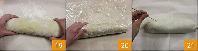 and roll it tightly 19, wrap it in plastic wrap 20 and let it rest in the refrigerator for about 4 hours. After this time, remove the plastic wrap and wrap the spinach dumpling roll in parchment paper, poke holes with a skewer 21 and wrap the roll in muslin (a very light fabric ideal for cooking foods)