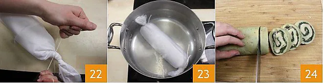 tie the two ends of the fabric with kitchen string 22 and cook the spinach dumpling roll in salted boiling water for about 30 minutes 23. If you don't have muslin, you can wrap the roll in aluminum foil and proceed in the same way. Once cooked, let the roll cool, cut it into slices about 0.4 inches thick 34