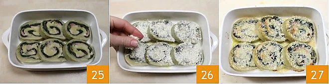 and place it in a slightly oiled baking dish 25. Sprinkle with grated Grana Padano 26 and, if you prefer, with melted butter. Let gratin in a preheated oven at 392°F for about 15 minutes until the surface of the slices is golden. Your spinach dumpling roll is now ready to be enjoyed.