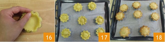 With another scalloped cutter with a diameter of 2.4 inches, cut out another 8 circles 10. Brush 8 aluminum tartlet molds with a diameter of 2.75 inches 11 and line them internally with a 3.5-inch dough disk 12;