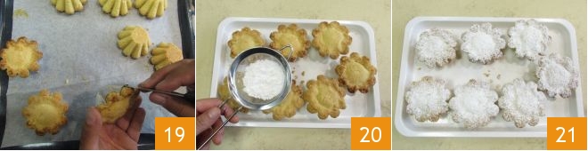 let them cool slightly and then remove them from the molds by running a knife along the edge 19. Dust the surface of the gobeletti with powdered sugar before enjoying them (20-21)!