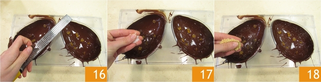 Now turn the mold upside down to allow the excess chocolate to escape 13: you can collect it on a tray and reuse it. Then leave the mold upside down on a rack for a few more seconds to let the excess chocolate drip off 14. Now embellish the inside of the egg by adding candied orange cubes 15.