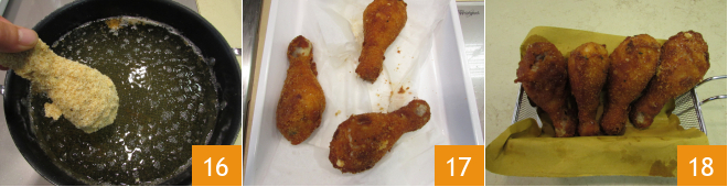 Heat plenty of vegetable oil in a non-stick pan to prevent the chicken from sticking to the bottom. Once the oil reaches 340-350°F, proceed with frying each drum 16: it will take about 5 minutes, we recommend not to immerse all the pieces at once to prevent the temperature from dropping too much. When they are golden and crispy, drain them 17 and as soon as they are all ready, you can serve your Grana-crusted chicken thighs with a pinch of salt on the surface 18