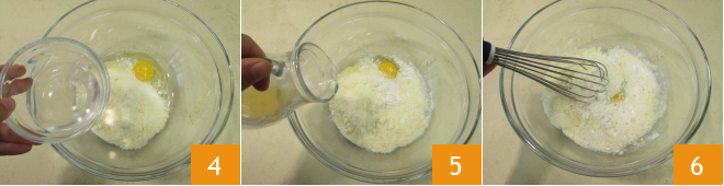 the egg, the water 4, and the beer 5 into a bowl. Mix everything with a hand whisk 6,