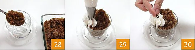 Stir the granita one last time, keeping in mind that the more you break the crystals, the finer they will become. Now compose the granita: with a spoon, pour the coffee granita into a small glass or cup 13, decorate with a dollop of whipped cream 14 and a coffee bean 15. Your coffee granita is ready to be served and accompanied by the mini madeleines!