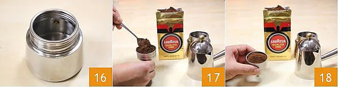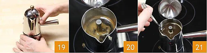 Close the coffee maker very tightly 4 so that the coffee doesn't spill out from the sides while it rises, and place it on a low and steady flame to obtain full-bodied coffee. As the coffee rises, a dense froth will form 5: we recommend not letting the coffee boil too long to maintain its sweetness and aroma. Your coffee is ready: before using it, stir it directly in the moka pot with a teaspoon to make the coffee more homogeneous 6.