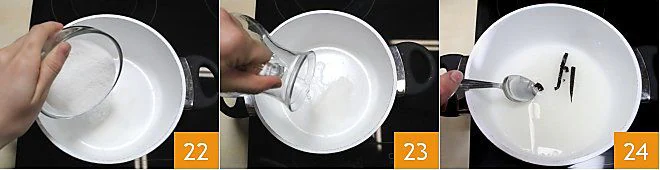 Now, proceed with the granita: in a non-stick saucepan, pour the sugar 7 and add the water 8. After cutting a vanilla pod in half, empty it and add it to the water and sugar along with its seeds 9 and bring to a boil.