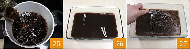 Then add the freshly made coffee 10 and transfer the mixture into a low and wide container 11 to speed up the freezing process. Let it cool, remove the vanilla pod, and cover the container with a layer of plastic wrap. Place in the freezer for at least 15-20 minutes. When the mixture has solidified, break the ice crystals with the tines of a fork or a whisk every 10-15 minutes, repeating the operation 2-3 times 12. Each time, the time will decrease because the preparation is already cold, so it will take less time to solidify the mixture. This operation must be carried out gently so as not to alter the color of the granita. Indeed, if it incorporates too much air, it risks turning beige rather than remaining dark brown. In the meantime, whip the fresh liquid cream and powdered sugar with an electric mixer to garnish the granita.