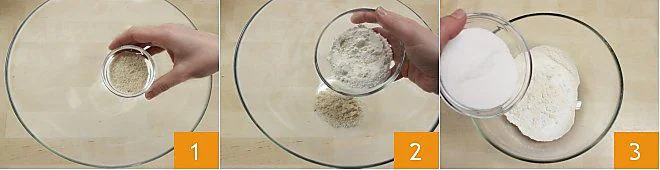 To prepare the mini madeleines, start by putting the almond flour in a bowl 1. Add the sifted all-purpose flour 2 and the sugar 3.