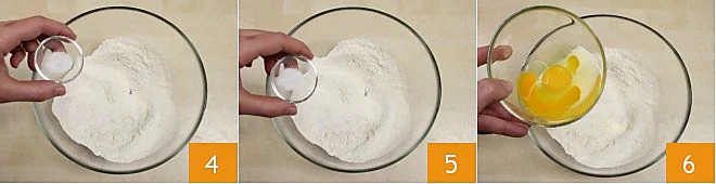 Add the salt 4, the sifted baking powder 5, and the eggs 6.