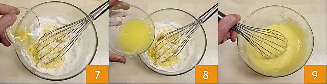 Continue by adding the honey 7 and the previously melted butter 8, then mix well with a hand whisk 9.