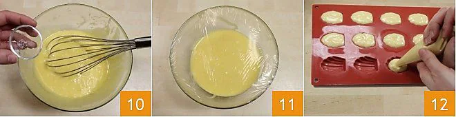 Finally, add the almond flavoring 10. Cover the dough with plastic wrap and let it rest in the refrigerator for at least two hours or, if you can, overnight 11. Pour the mixture into a piping bag and then take a silicone mini madeleine mold with the classic shell shapes, and fill all the molds 12. If you don't have a silicone mold, you can also use a metal mold and pour the batter with a teaspoon.