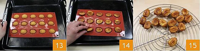 Transfer the mold onto a baking sheet and bake in a static oven at 375°F for about 12 minutes, or if using a convection oven, bake at 340°F for 6-7 minutes 13; if using a metal mold, bake at 355°F until they turn golden. Once they have cooled a bit, gently remove them from the mold 14 and let them cool on a rack 15. Store them under a glass dome or in a container to keep their fragrance.