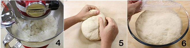 and start kneading with the hook, slowly adding the remaining water 4. When you have obtained a smooth and soft consistency, typical of bread dough, transfer the mixture onto a floured board and briefly knead it by hand 5. Form a ball and place it in a bowl, covered with plastic wrap (or a clean and damp cloth), then let it rise for a couple of hours in the oven, turned off and closed but with the light on: the dough should double in volume 6.
