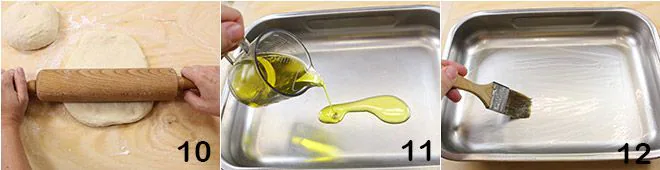 Now divide the bread dough into two parts and roll them out both with the help of a rolling pin, until you obtain a thickness of 0.39 inches 10. Oil a baking tray with dimensions of 15.75 x 11.81 inches 11, using a brush 12.