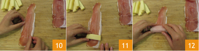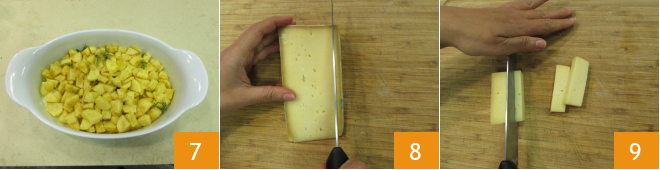 The potatoes should not overlap too much 7. Bake them in a preheated static oven at 392°F for 30 minutes. Meanwhile, prepare the roll-ups: first, remove the rind from the cheese 8, cut out 8 sticks 9.