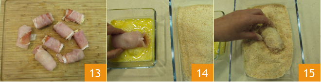 Repeat this operation for all the chicken slices 13 and as soon as you have formed all the roll-ups, pass them one at a time first in the egg 14 and then in the breadcrumbs 15, making sure to cover the ends well.