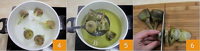 Boil the artichokes in previously salted boiling water 4, until they become tender but not mushy. Once cooked, drain them 5, let them cool slightly, and cut them into slices 6.