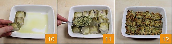 Place the slices of artichokes, slightly overlapping each other 10. Sprinkle the breadcrumb mixture over the artichokes, covering them all 11, and place the artichokes in the oven to gratinate at 356°F for 15-20 minutes, until a golden crust appears on the artichokes 12.