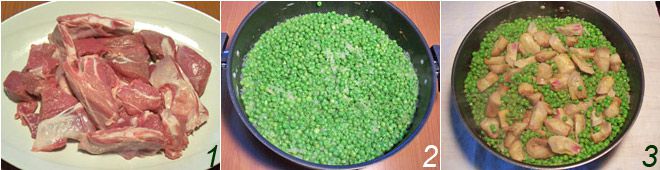 Prepare 2 cups of vegetable broth. Meanwhile, cut the lamb meat into pieces, remove all the fat you can, wash it, and dry it 1. Chop an onion and let it soften in a pan with 3 tablespoons of oil; then add the peas 2 and the artichoke hearts cut into quarters 3 to see how to clean artichokes, watch the video How to clean artichokes, and let them cook over moderate heat until they become tender but not mushy, adding broth as needed. Finally, adjust with salt.