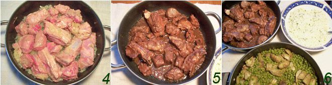 Then chop the other onion and let it soften over low heat in another pan with another 3 tablespoons of oil, and then add the lamb pieces 4. Just let the meat whiten (not brown), then adjust with salt and immediately add the glass of red wine, allowing the lamb to cook over moderate heat, covered with a lid for about 20 minutes, until the cooking liquid thickens 5.