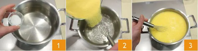 To prepare the polenta and porcini mushroom terrines, start by making the polenta. In a large pot, pour the water, add the coarse salt 1, a drizzle of oil, and bring it to a boil. Then gradually pour in the polenta flour 2 while stirring initially with a whisk to obtain a lump-free mixture 3.