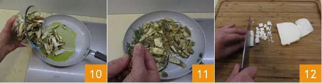 Meanwhile, focus on How to Clean Porcini Mushrooms: using a small knife, remove the excess soil from the stem 7 and clean the entire mushroom with a slightly damp cloth 8. At this point, slice the porcini mushrooms, not too thinly 9.
